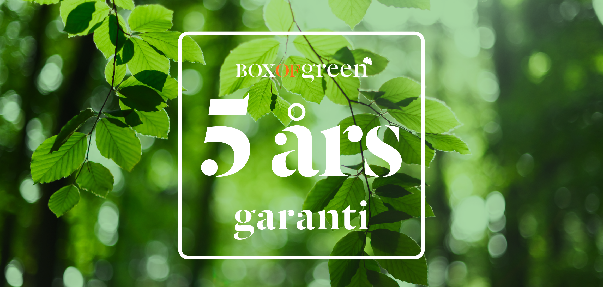 For at sikre din tryghed og træernes vækst, tilbyder vi en 5-års garanti på ALLE nyplantede træer, når du placerer en ordrer på mere end 10 BOXofGREEN-plantekasser. Garantien dækker træernes sundhed og etablering. Hvis et træ, mod forventning, ikke skulle overleve de første 5 år - trods aftalt trævalg og pleje - planter vi et nyt uden ekstra omkostninger.